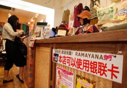 日本沖繩奧特萊斯,商家貼出銀聯卡消費標志