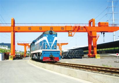 走在寬闊的物流園區里,兩座橙紅色的大型吊裝設備格外顯眼。走近一看,鐵軌、貨車、裝卸吊臂……兩條鐵路線正在物流園區里緊張地忙碌著,而這無疑讓記者感到驚奇。“這是我們華駿物流園的兩條鐵路專用線。”張潔解答了記者的疑問,“它全長2.6公里,與膠濟鐵路相連通,可與其共享通達全國的鐵路交通網絡,從而為所有進出青島的大宗物資提供了一個優良的集散交易基地。”據張潔介紹,園區內的兩條鐵路專用線,主要用來運輸棉花、卷紙以及橡膠等大宗的生產資料,為區域內的企業提供原材料。