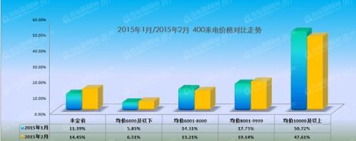 從2015年2月400來電價格對比走勢圖來看,均價10000元/㎡及以上的“萬元盤”市民咨詢的最多;排名第二的依然是均價8001—9999元/㎡的“準(zhǔn)萬元盤”。也許是受到多個新盤問世但并未公開售價的影響,2月份未定價的新盤的關(guān)注度有所上漲。均價在8000元/平方米以下的新盤普遍比較受冷落。