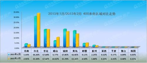 具體來看,2015年2月市北區(qū)400去電量區(qū)域?qū)Ρ葦?shù)據(jù)占比33.30%,與1月基本保持持平,微漲了0.04個百分點的占比;排名第二的李滄區(qū)關(guān)注度占比也與1月份相比持平,微跌0.04個百分點;城陽和黃島400去電量區(qū)域?qū)Ρ葦?shù)據(jù)占比分別為15.7%和13.26%;嶗山區(qū)與1月相比關(guān)注度占比上漲了3.25個百分點。
