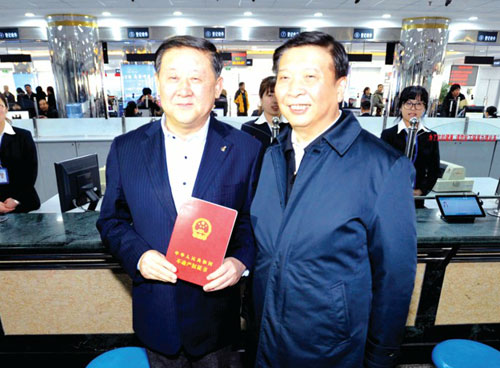 昨日上午,國土資源部部長、黨組書記姜大明為不動產權利人市民徐建軍頒發了全國首批、山東省第一本《不動產權證書》。 “今天領到這個證很高興,也很激動,過去是房地產證,現在變成了不動產權證,這是咱們國家依法治國、落實《物權法》的一個非常好的舉措,是老百姓能夠確權、維權的一件大好事,這是一種進步,而且這個流程也比較順暢。”徐建軍激動地說。記者看到,徐建軍手中持有的證書編號為37000000001號,他表示自己在市南區魯商首府購置了一套100多平方米的商品房,山東省1號《不動產權證書》對自己居住這套房子有特別的意義。