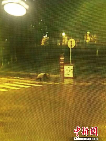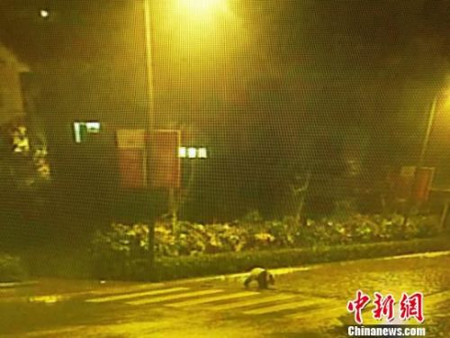 監(jiān)控視頻顯示,一只憨態(tài)可掬的成年大熊貓?jiān)谠摼皡^(qū)綠化帶出現(xiàn),然后穿過街道,扒著鐵門試圖翻門而入未果,走過兩條斑馬線,最后跳上花臺翻入景區(qū),悠閑地?fù)P長而去,消失在了夜色中。