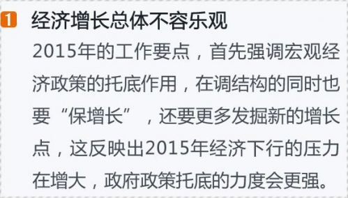 上述對比反映出2015年政府工作側重點和2014年有所不同。2014年政府工作要點以“改革”為先,強調經濟運行只要保持在合理區間即可,更突出經濟發展的質量;而2015年的工作要點,首先強調宏觀經濟政策的托底作用,在調結構的同時也要“保增長”,還要更多發掘新的增長點,這反映出2015年經濟下行的壓力在增大,政府政策托底的力度會更強。