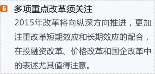 總的來看,去年改革首當其沖的是政府改革,而十八屆三中全會提出的具體改革,大體在啟動階段。而2015年,改革將向縱深方向推進,更加注重改革短期效應和長期效應的配合。