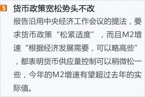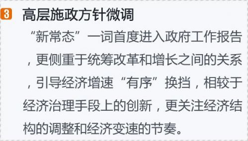 值得注意的是,今年《政府工作報告》在提出工作總體要求后,提出要把握三個要點,分別是“穩定和完善宏觀經濟政策”、“保持穩增長和調結構的平衡”、“培育和催生經濟社會發展新動力”,而去年則分別是“向深化改革要動力”、“保持經濟運行處在合理區間”、“著力提質增效升級、持續改善民生”。