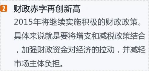 2015年將繼續實施積極的財政政策。李克強專門強調,財政政策要“加力增效”,具體來說,就是要將增支和減稅政策結合,加強財政資金對經濟的拉動,并減輕市場主體負擔。