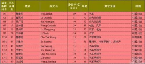 據蓋世汽車網報道,《福布斯》雜志發(fā)布了2015年全球億萬富豪榜,蓋世汽車網經過整理,找到50位業(yè)務同汽車相關的富豪,其中中國大陸和港臺地區(qū)有13人,包括中國汽車圈最富的魏建軍等高管。