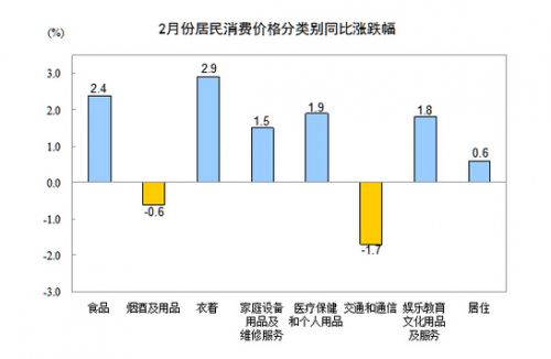 環比看來,2月份,非食品價格環比上漲0.3%。娛樂教育文化用品及服務、家庭設備用品及維修服務、醫療保健和個人用品、交通和通信價格分別上漲1.0%、0.6%、0.5%和0.5%;衣著、煙酒及用品價格分別下降0.3%和0.2%;居住價格持平。