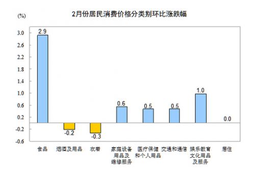 2月份,全國居民消費價格總水平環比上漲1.2%。其中,城市上漲1.3%,農村上漲1.0%;食品價格上漲2.9%,非食品價格上漲0.3%;消費品價格上漲1.3%,服務價格上漲0.9%。