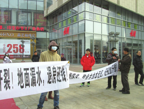 2014年1月4日,位于偉東樂客城一側(cè)的偉東樂客街入口處,30余位業(yè)主手持橫幅“聲討無良開發(fā)商”。記者采訪獲悉,這些人主要是偉東樂客街商鋪二樓的業(yè)主,樂客街是偉東樂客城的附屬商業(yè)街,商鋪業(yè)主于2013年5月31日收房之后,一直沒有拿到房產(chǎn)證,而且質(zhì)量問題頻頻出現(xiàn)。“從收房到現(xiàn)在,我們都沒有看到房產(chǎn)證,后來我們專門咨詢市質(zhì)監(jiān)局和市城鄉(xiāng)建設委相關(guān)部門才知道,房子是不具備交房條件的。”韓女士無奈地說。違規(guī)交房不久,房屋的質(zhì)量問題就開始顯露,韓女士告訴記者,早在2013年10月份一樓的業(yè)主就出現(xiàn)漏水滲水現(xiàn)象,后來多次交涉之后,開發(fā)企業(yè)才找人做防水處理。而在做防水過程中,在未征得二樓業(yè)主同意的情況下,私自開掘,給二樓業(yè)主造成了很大的麻煩。“交房之前店鋪頂部便漏水,開發(fā)商只是簡單用膠填充了一下裂縫。商鋪交付后,依然嚴重漏水,開發(fā)商先后三四次將二樓店鋪走廊的地磚砸開做防水,問題仍然沒有解決。”店鋪位于一樓的曾先生告訴記者。