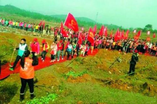 網曝3月12日植樹節當天,零陵區婦聯、區林業局等單位組織植樹,一些穿著志愿者服裝的人員踩在紅地毯上,舉著旗子,拿著鋤頭等植樹工具,走向植樹活動現場。