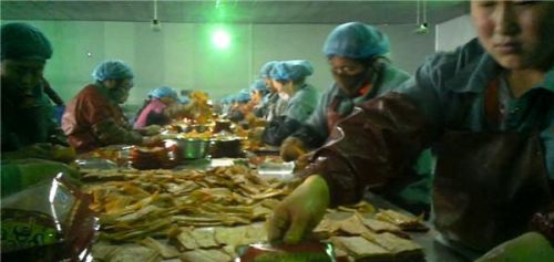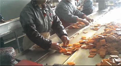 幾經(jīng)周折,記者進(jìn)入幾家麻辣食品廠區(qū)內(nèi)部。已經(jīng)開(kāi)工的幾家食品廠,現(xiàn)場(chǎng)情景基本相同:巨大的簡(jiǎn)易車(chē)間里,兩名工人負(fù)責(zé)給不停轉(zhuǎn)動(dòng)的攪拌器添加原料,并將高溫膨化后的麻辣條等產(chǎn)品倒在傳送帶上。幾十名女工坐成一排,不停進(jìn)行小包封裝。