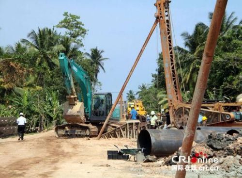 斯里蘭卡南部鐵路項(xiàng)目施工現(xiàn)場(chǎng)。一臺(tái)打樁機(jī)正在進(jìn)行鐵路橋橋墩作業(yè)。