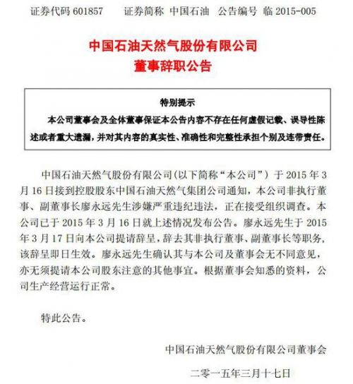 人民網北京3月17日電 據上海證券交易所網站消息,中國石油天然氣股份有限公司今天發布公告稱,廖永遠于2015年3月17日向本公司提請辭呈,辭去其非執行董事、副董事長等職務,該辭呈即日生效。