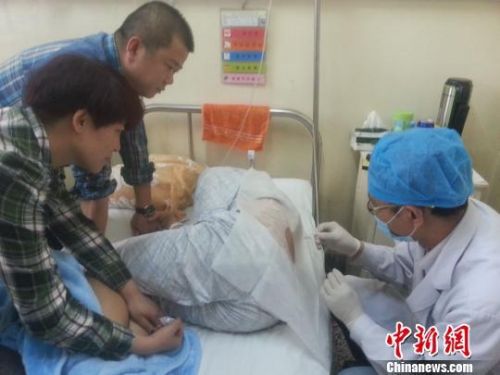 圖為被打致傷的胡瑞正在接受腰椎穿刺檢查。 胡貴龍 攝