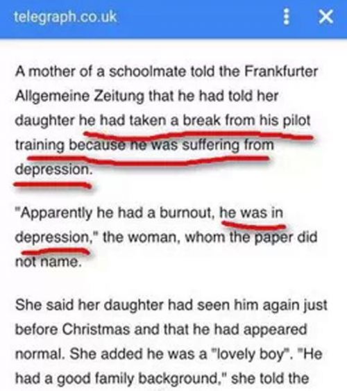 據(jù)英國《每日電訊報》報道,盧比茨的一位同班同學的母親告訴《法蘭克福匯報》,盧比茨中斷飛行訓練是因為他的抑郁癥發(fā)作。