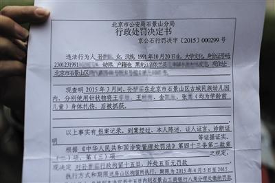 根據(jù)警方提供給家長的一份北京市公安局石景山分局行政處罰決定書顯示,涉事孫姓女教師今年不滿24周歲,大學(xué)文化,黑龍江人,具有幼師從業(yè)資格。警方查明2015年3月間,該教師在該幼兒園內(nèi),分別使用針狀物將4名學(xué)齡前兒童身體扎傷。