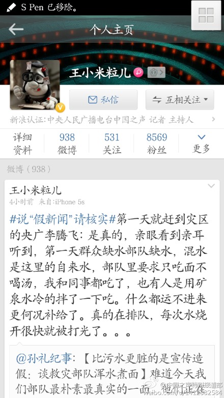 央廣記者稱“渾水煮面”屬實:軍隊要求只吃面不喝湯 2014-08-06 09:57 array(1) { [1663]=> array(1) { [4]=> array(1) { [0]=> string(12) "中國之聲" } } } 中國之聲 0 微博截圖 @中國之聲特別報道部:#沒有調查就沒有發言權# 渾水煮面發生具體時間是8月4日,發生地點為震中龍頭山鎮的龍全中學。原因是當時食品匱乏,只能吃外面輸送進來的泡面,地下水和自來水因為地震水質現在比較渾濁,目前救援人員只能用渾水泡面做飯。央廣記者李騰飛親眼看見,部隊要求只吃面不喝湯,他和同事都吃了。