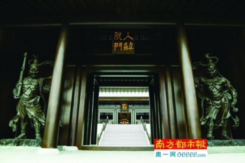 大雄寶殿以佛光寺東大殿為藍本,并參考奈良唐招提寺金堂比例。何培斌介紹,唐代大殿柱梁用的是紅色,為保存清凈感覺,改為紫檀原木顏色,殿里供奉釋迦牟尼佛、藥師佛和阿彌陀佛,佛像后屏障處刻印了源自敦煌莫高窟的壁畫,下則陳列著國學大師饒宗頤親書《心經》卷軸。