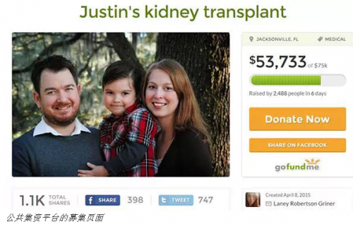 公共集資平臺Gofundme上,最近有一個(gè)為39歲父親籌款進(jìn)行腎臟移植的項(xiàng)目在短短6天內(nèi)就募集了近6萬美元,主頁上寫著這樣的一段說明:“賈斯汀今年39歲,急需進(jìn)行腎臟移植。請幫助我們完成我們的目標(biāo),這樣賈斯汀就可以接受預(yù)治療和移植。他的母親也因?yàn)橄嗤牟“Y去世,您的幫助能為他和他的兒子山姆書寫一個(gè)不一樣的故事。”