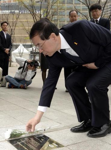 資料圖片:當地時間15日上午,首爾市長樸元淳前往首爾廣場,在廣場上的紀念碑前默哀并獻花,紀念“世越號”沉船事故遇難者。