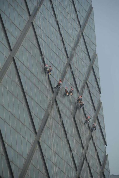圖為央視“大褲衩”清洗現場
