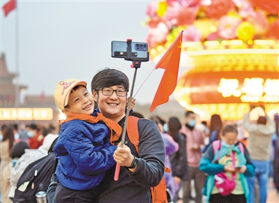 10月1日,游客在北京天安門廣場游覽拍照。新華社記者 李賀攝