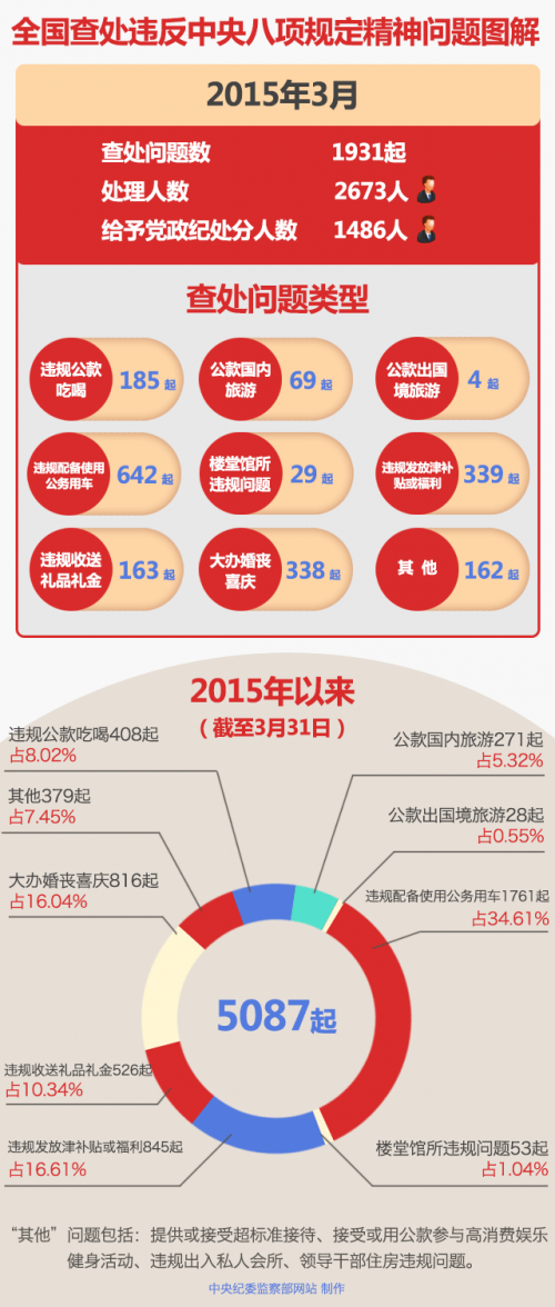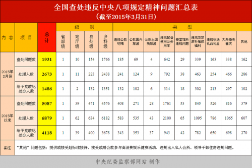 2015年3月,全國查處違反中央八項(xiàng)規(guī)定精神問題1931件,給予黨紀(jì)政紀(jì)處分1486人。