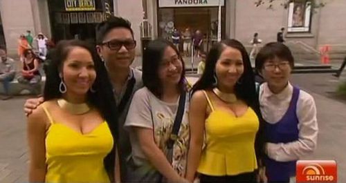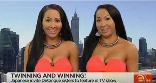 迪辛克姐妹已經花費25萬美元(約合人民幣155萬元)接受整容手術,以確保她們的相貌完全一致,包括隆胸、隆唇、假睫毛等。這對28歲的姐妹來自西澳大利亞珀斯(Perth),她們的出生時間僅相隔1分鐘。她們受邀飛赴世界各地,參加各種節目,包括日本的惡作劇節目,令電視制片人和參賽者都難以分辨。