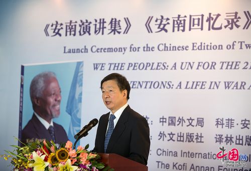 4月22日,由中國外文局、科菲·安南基金會共同主辦的《安南演講集》、《安南回憶錄》中文版首發儀式在北京舉行。科菲·安南基金會主席、2001年諾貝爾和平獎獲得者科菲·安南專程來京出席首發式活動,并對中國外文局進行了訪問。圖為中國外文局局長周明偉在首發儀式上講話。中國網楊佳 攝影