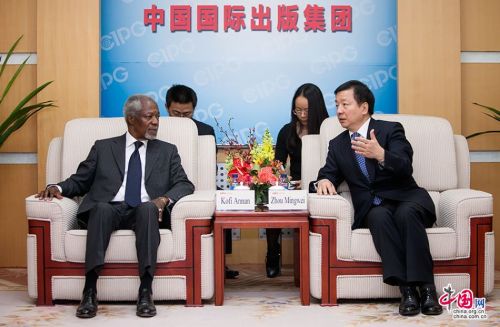 中國網北京4月22日訊(記者 吳佳潼)由中國外文局(中國國際出版集團)、科菲·安南基金會共同主辦的《安南演講集》、《安南回憶錄》中文版首發儀式22日在北京舉行。科菲·安南基金會主席、2001年諾貝爾和平獎獲得者科菲·安南專程來京出席首發式活動,并對中國外文局進行了訪問。中國外文局局長周明偉出席首發式,并接待了到訪的安南一行。