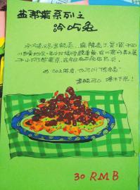 大安燒牛肉,冷吃兔,老街兔,7分鐘豆腐魚……活靈活現(xiàn)畫在了一張張紙上,還在圖畫旁配上關(guān)于美食的來歷、制作步驟、材料、價(jià)格。 這樣的手繪,囊括自貢許多特色美食,活脫脫的自貢美食指南。隨后,這部“指南”瞬間在網(wǎng)絡(luò)躥紅,讓眾多網(wǎng)友為其點(diǎn)贊,并猜測作者是大叔還是阿姨。可誰曾想到,作者其實(shí)是名初中女生叫黃婧蕓,她說作品靈感來自對美食的熱愛,而自貢美食中她單對冷吃兔情有獨(dú)鐘。