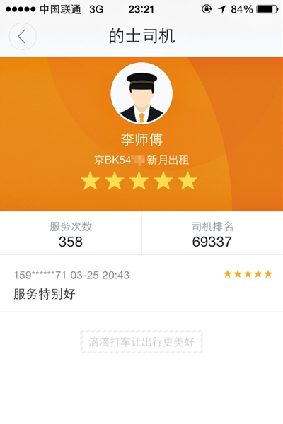 同樣,記者向“滴滴打車”投訴在順義遇到的黑車司機李某后,約一個小時過后,李某就找到并撥通了記者的手機號。