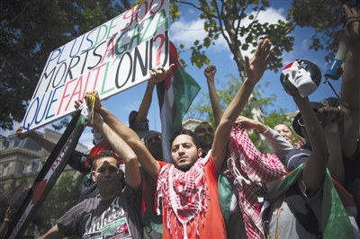 7月26日,法國巴黎,支持巴勒斯坦的抗議者們高舉條幅,抗議以色列對加沙地帶的軍事行動。近期,歐洲各國爆發多起抗議以色列的示威游行。