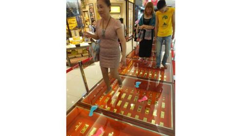 2014年9月,消費者走在一家商場內為促進黃金周消費而用606塊金磚鋪設的過道上