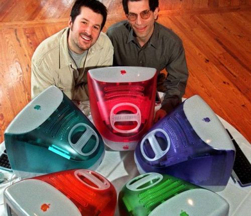 1999年3月,蘋果設計師喬納森·艾維(左)和蘋果工程副總裁喬恩·魯賓斯坦坐在早期的iMac電腦前