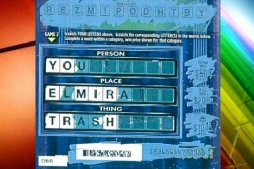 艾米拉市22歲的男子萊諾夫上月購買了新發行的“幸運輪”刮刮樂彩票,刮完后竟然發現離譜的3排文字:“你”(you)、“艾米拉市”(Elmira)和“垃圾”(trash)。