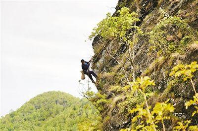 鎖定目標,攀爬到崖頂,選擇一棵看起來穩固的樹干。約十分鐘工夫,扎好安全帶,系上編織袋,將繩端座圈套在屁股上,慢慢放繩,這時候,一定要將繩子扎牢,否則腳下就是深淵。遇到大小合適的巖耳,甚至需要左搖右蕩,橫著身子穿行于樹叢間。動畫片里人猿泰山那一套,老吳幾乎都會。運氣好,這樣一上一下能摘個1公斤以上。去年,他就在鎮里的一處絕壁,花了兩三天時間,摘了5公斤多。大多數時候,一次摘個半公斤左右,已算收獲不小了。