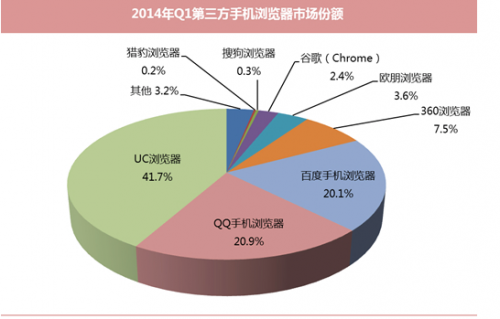 360手機助手,應用寶和百度手機助手,背后都有導量支撐:2014年Q1,中國手機瀏覽器市場占有率,QQ手機瀏覽器第二,20.9%;百度手機瀏覽器第三,市場占有率20.1%;360手機瀏覽器市場占有率7.5%,位居第四。除此之外,殺毒軟件,地圖等都可以為它們導量。