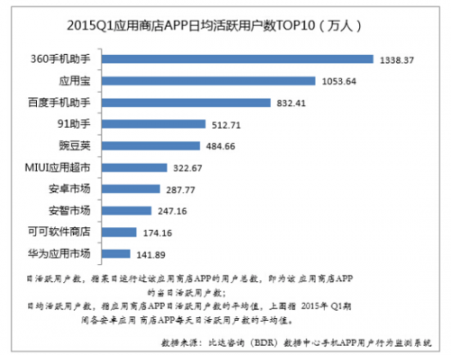 第三方數據統計,2015年Q1,Android應用商店APP TOP 10中,360手機助手日均活躍用戶數排行第一,1338.37萬;應用寶以1053.64萬位居行業第二;百度手機助手位居行業第三名,832.41萬。此外,第四名到第十名分別是91助手、豌豆莢、MIUI應用超市、安卓市場、安智市場、可可軟件商店和華為應用市場,日均活躍用戶均不足600萬。