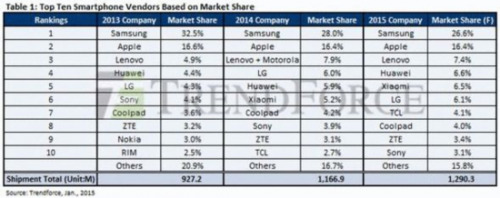 第三方市場調研機構trendForce發布的最新報告顯示,2014年全球智能手機出貨量達到了11.67億部,中國合計達到了4.534億部,貢獻了40%的份額。其中, LG智能手機出貨量為7000萬部、聯想9000萬部、華為7000萬部、小米6000萬部、酷派4690萬部……