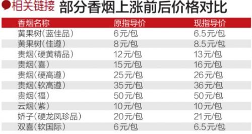 “漲了漲了,從今天開始就漲了。”昨日,當記者再次來到位于貴陽市云巖區友誼路附近的香煙零售店時,老板汪先生告訴記者,雖然店里的價格標簽還沒有更換,但從5月11日開始,接到貴州中煙公司的通知后,店里的香煙已經開始按調整后的價格賣了。