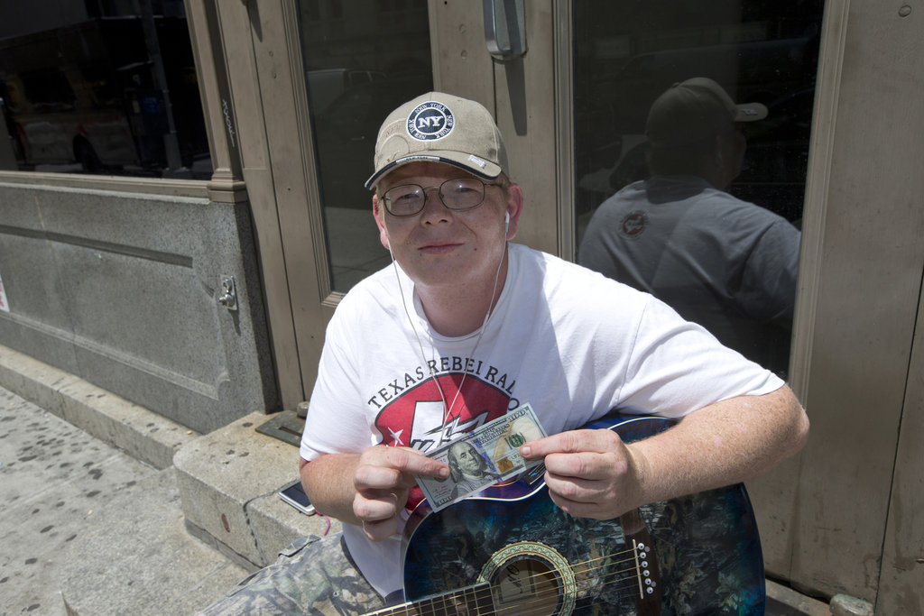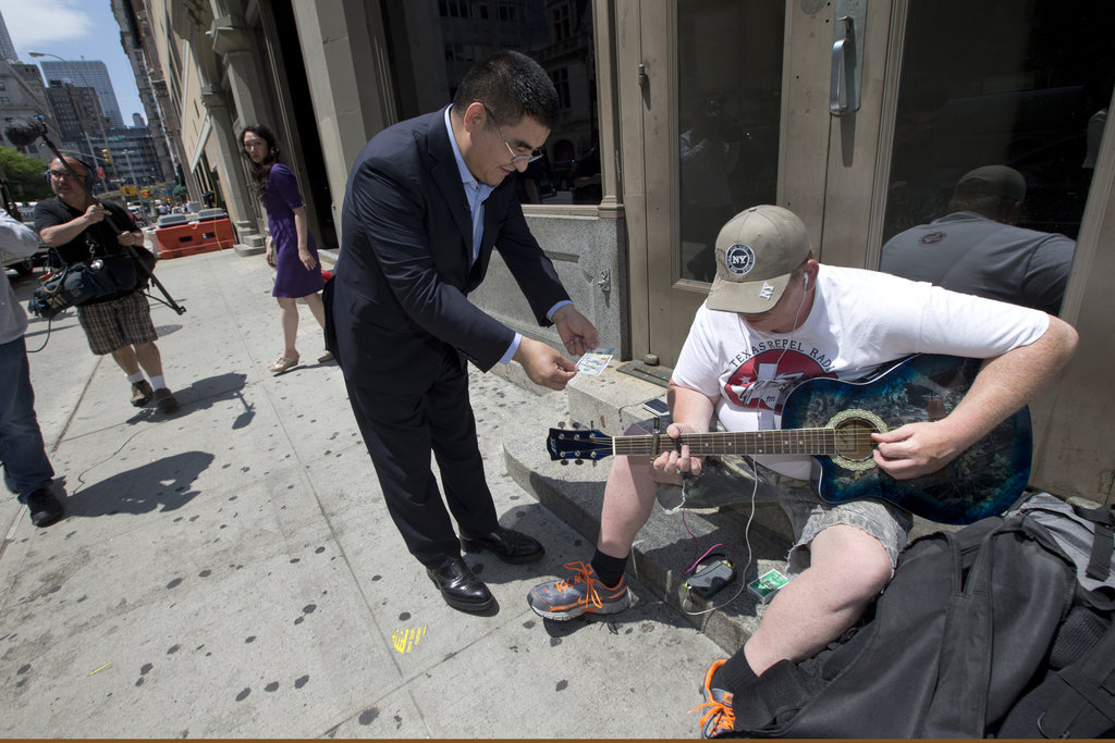 當(dāng)?shù)貢r(shí)間2014年6月24日,美國(guó)紐約,中國(guó)富翁陳光標(biāo)在紐約街頭向流浪漢和街頭藝人贈(zèng)送百元紙幣,有的人拒絕了他遞過(guò)來(lái)的錢。