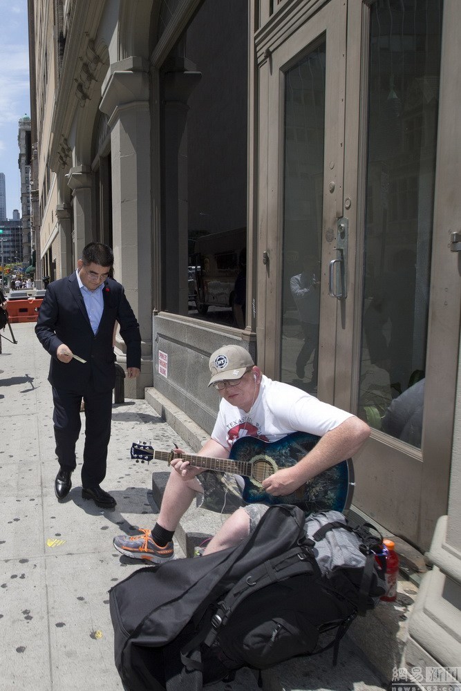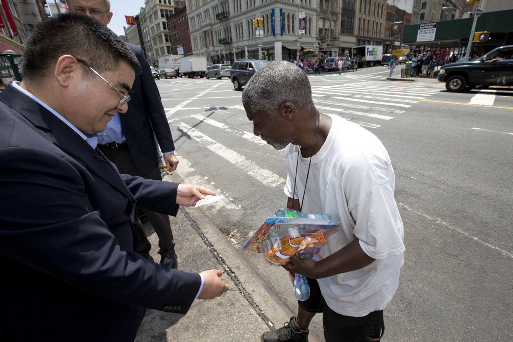 當(dāng)?shù)貢r(shí)間6月24日,美國(guó)紐約,陳光標(biāo)在紐約街頭向流浪漢和街頭藝人贈(zèng)送百元紙幣,一男子拒絕了他遞過(guò)來(lái)的錢。