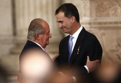 在西班牙首都馬德里舉行的國王退位法令簽署儀式上,國王胡安·卡洛斯一世(左)擁抱王儲費利佩。