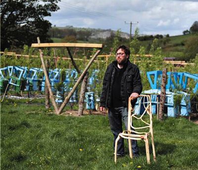 這座“家具種植園”位于德比郡威克斯沃思附近,園中柳樹、橡樹、榛子樹等多個品種的樹木排列成行,樹枝沿著藍色塑料模具生長。其中大約150棵長成倒置的扶手椅的形狀,另有100棵呈現柱狀燈罩、六邊形鏡子邊框等形狀。