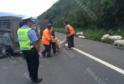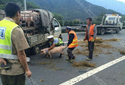 【四川雅西高速貨車側翻 60只豬“末路狂奔”】26日下午6點過,雅西高速路一貨車側翻,車上60多只小豬上演“末路狂奔”……幸虧交警及時到場,一人抓前腿、一人逮后腿,1個多小時后才把它們全逮住。