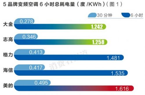 結(jié)果顯示,大金、志高空調(diào)在6小時(shí)內(nèi)測(cè)試的總耗電量較低,而美的空調(diào)的省電效果在五大品牌中表現(xiàn)最差。