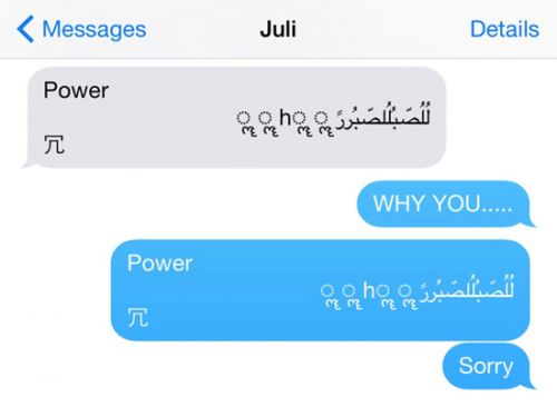 人們已經開始惡意地使用這串字符,使收到這串字符的人不再能接收任何消息。但若發送惡意字符的人再緊接著發送一條其他信息,就可以“解鎖”接收者的短信應用。但據Twitter用戶說,那些開惡意玩笑的人并不愿意再發送消息來“解鎖”別人的應用。更嚴重的是,這串字符文本無論是通過蘋果手機的短信服務發送還是其他手機短信服務發送,都會產生一樣的效果。這意味著安卓或者微軟手機用戶可以通過一個簡單的本文對蘋果手機的短信服務進行控制。
