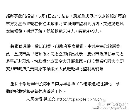 【一萬(wàn)州籍游輪在長(zhǎng)江水域湖北監(jiān)利段傾覆 重慶市已派出工作組趕赴現(xiàn)場(chǎng)】據(jù)海事部門(mén)報(bào)告,6月1日22時(shí)左右,隸屬重慶萬(wàn)州東方輪船公司的東方之星號(hào)游輪在長(zhǎng)江水域湖北省荊州市監(jiān)利縣境內(nèi),突遇龍卷風(fēng)發(fā)生傾覆。初步了解,該船核載534人,實(shí)載449人。